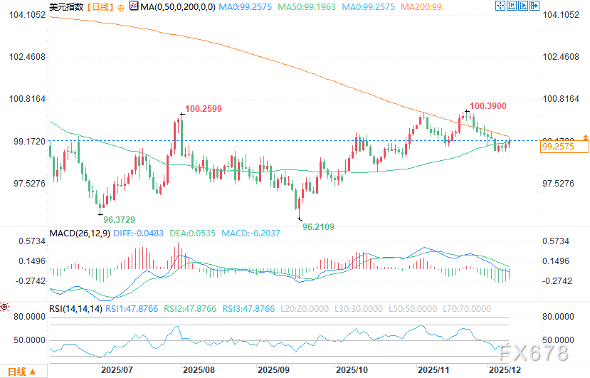 汇通财经APP讯——周二(12月9日)美盘时段,美元指数小幅幅走高,多头收复位于99.197的50日移动平均线,并推