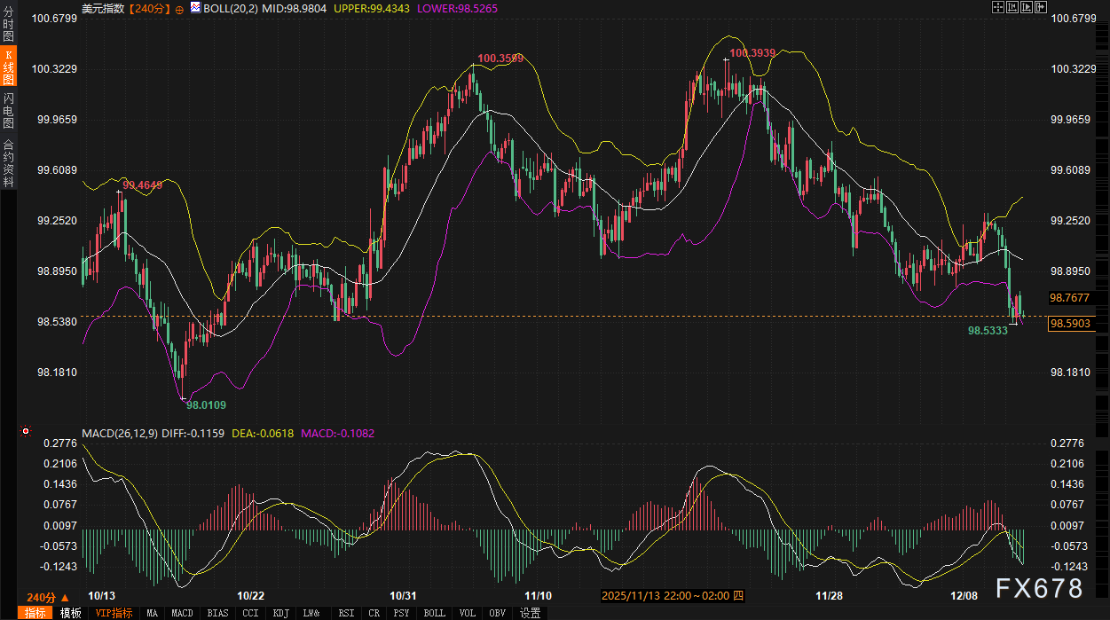 美元指数日线呈现明确空头排列,价格紧贴布林带下轨(98.5243)运行,MACD死叉向下发散。